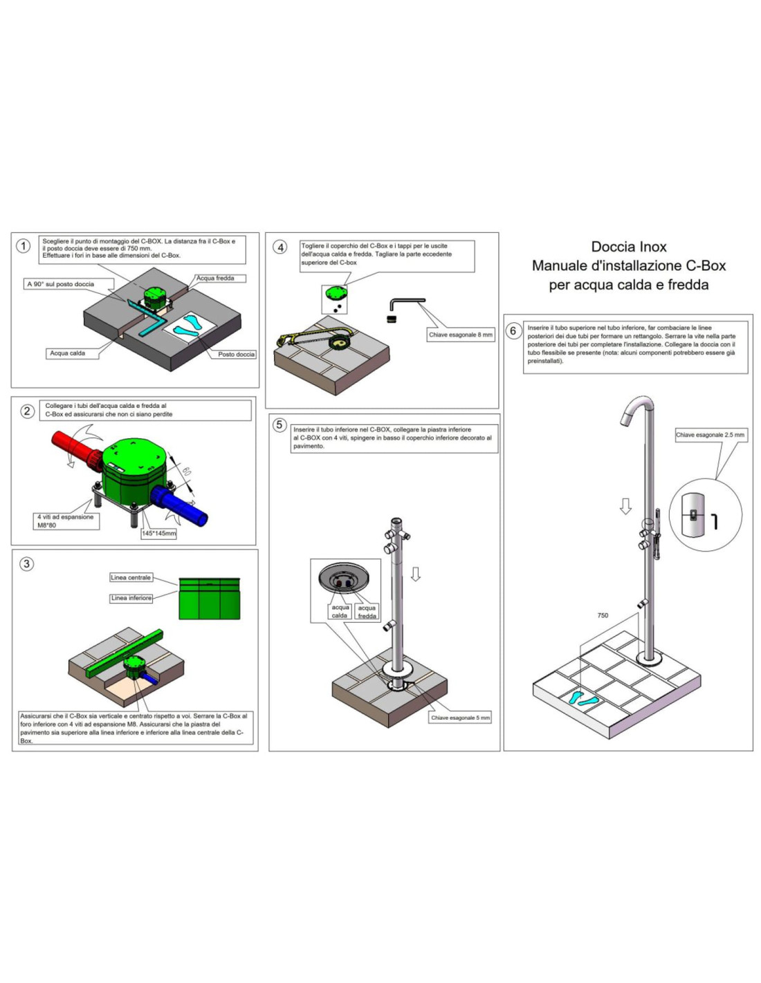 Si consiglia l`installazione della doccia su un supporto solido, perfettamente in piano e livellato, capace di sostenere il peso della doccia ed di impedirne la caduta come un pavimento in cemento, pietra, una base in calcestruzzo, ecc. Il fissaggio avviene tramite i tasselli in dotazione e il C-BOX in dotazione.