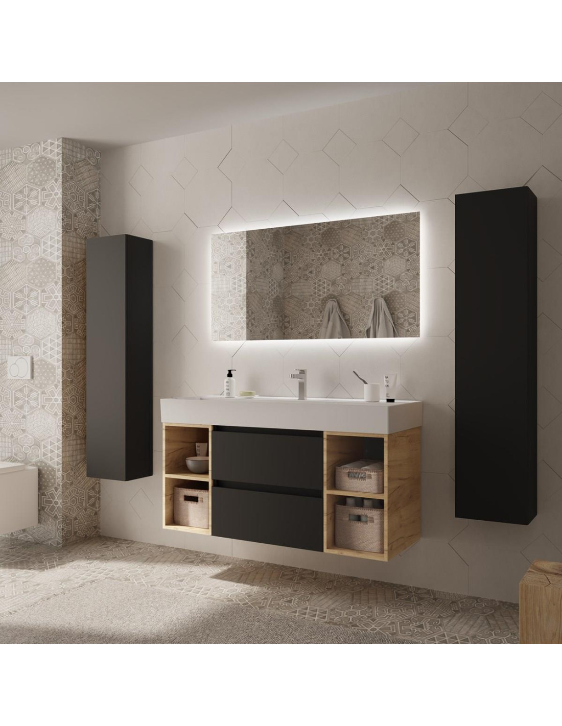 Composto da una cassettiera nera opaca da 60 cm a 2 cassetti + 2 cassettiere su entrambi i lati della cassettiera in rovere da 30 cm a 2 fori + Lavabo integrato.
